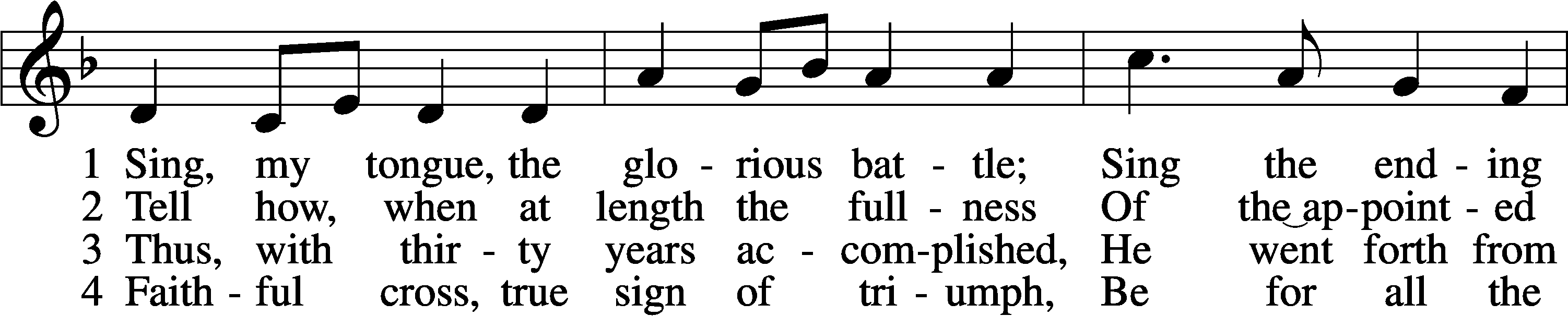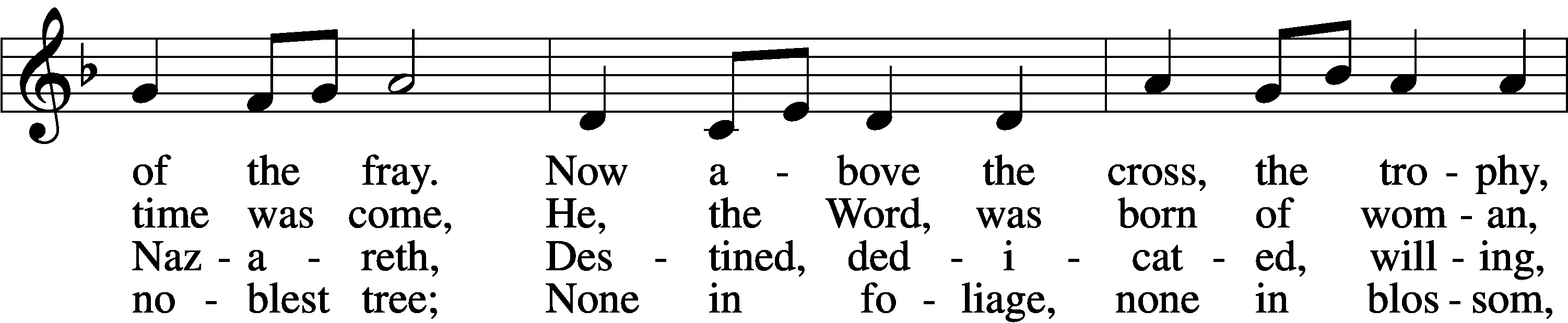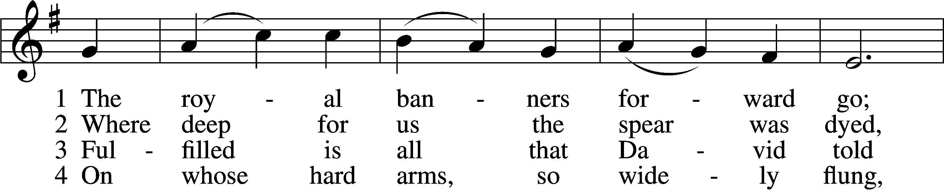 Text: Venantius Honorius Fortunatus, c. 530–609; (sts. 1–4): tr. John Mason Neale, 1818–66, alt.; (sts. 5–6): tr. The Hymnal 1982