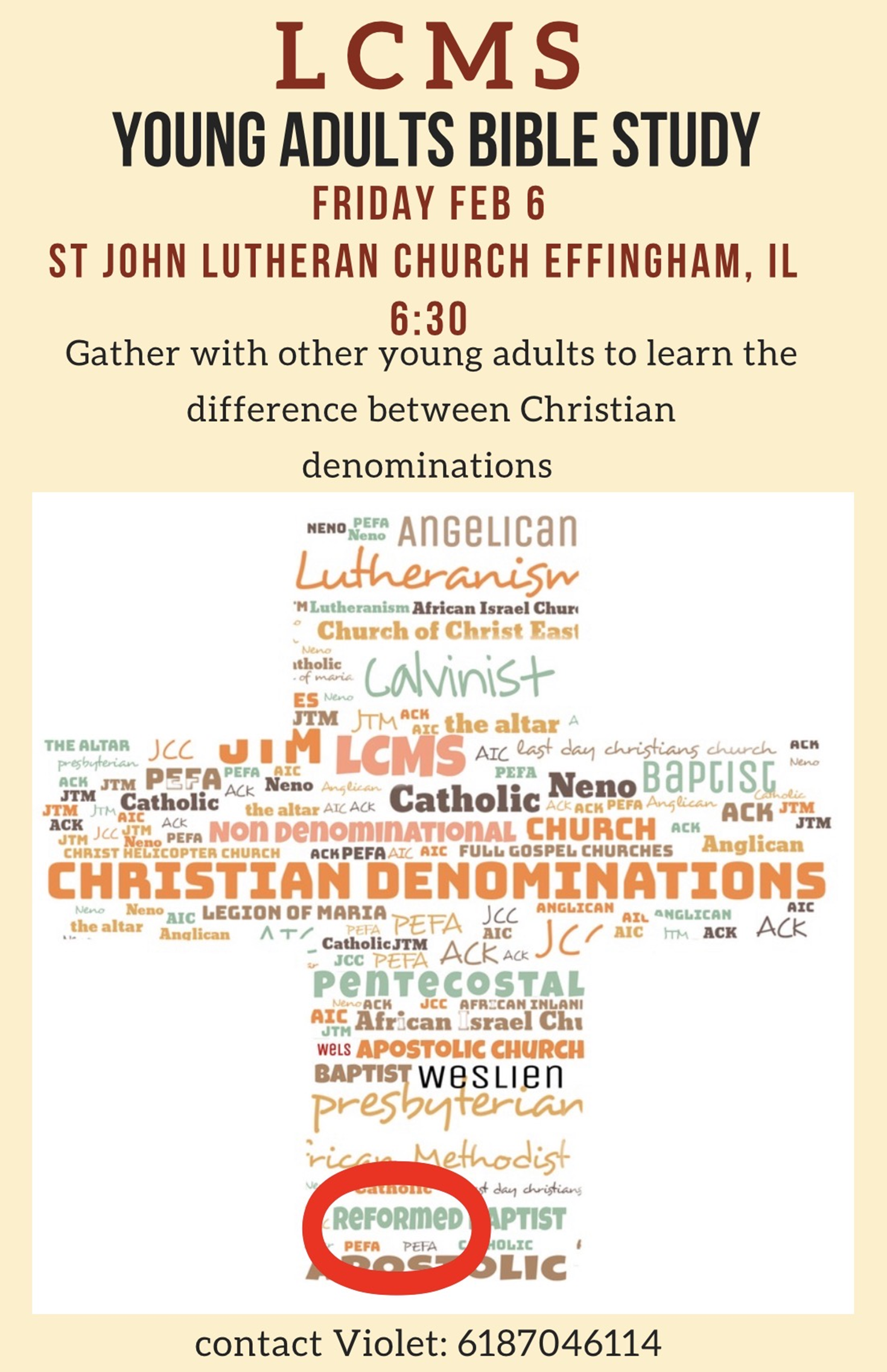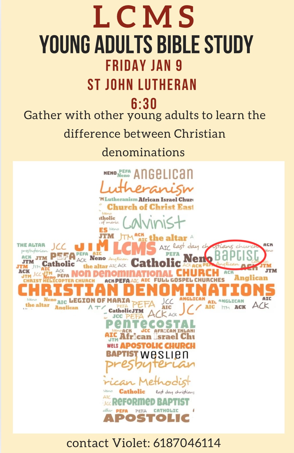 The Young Adult Bible study will begin a new series of studies starting January 9th. This new series will be covering the differences between different Christian Denominations. We will continue to meet every other Friday at 6:30. The location will vary depending on which pastor is leading. All young adults ages 18-35ish are invited.