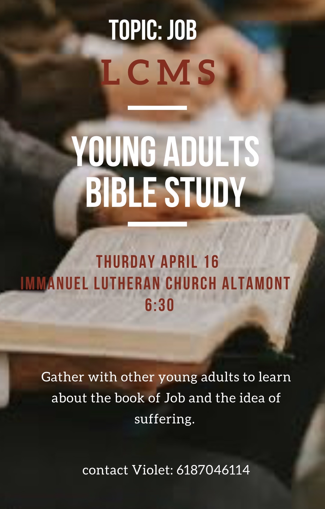 The next study will lead by Pastor Niermann at Immanuel Lutheran Church in Altamont on Thursday, April 16 at 6:30, the new topic will be Job.